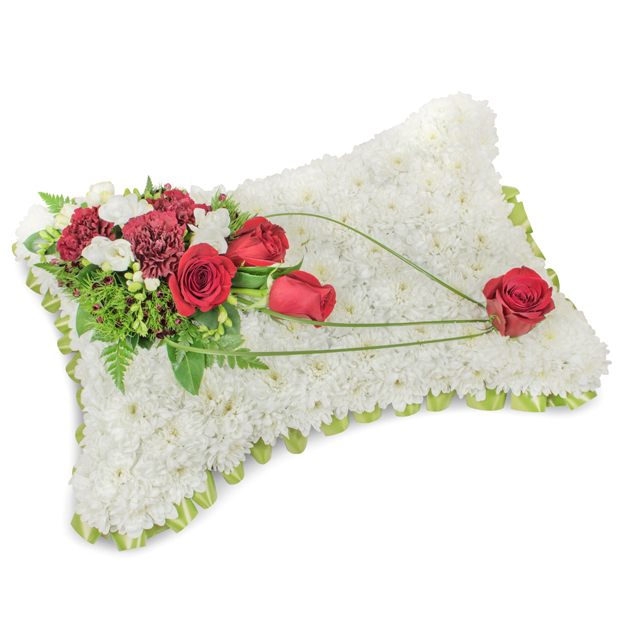 Convey your sympathies with our luxurious bouquet, featuring a refined selection of white chrysanthemums, red roses, white freesias, dark red carnations, dianthus, and bear grass. This elegant arrangement is designed to honor and remember your loved ones.