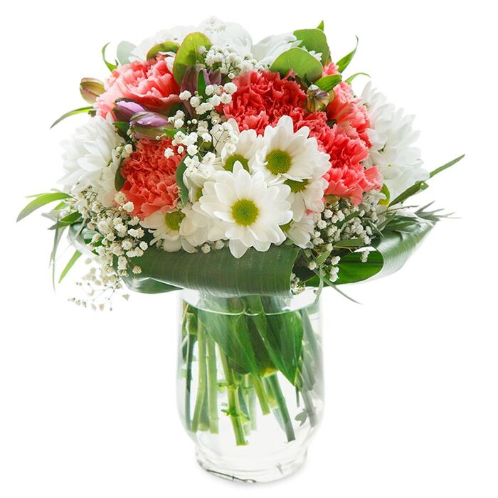 Bring joy and elegance with our luxurious flower arrangement. This unique bouquet showcases a soft palette of snow-white chrysanthemums, light pink carnations, and delicate gypsophila, all beautifully arranged with vibrant aspidistra leaves.
